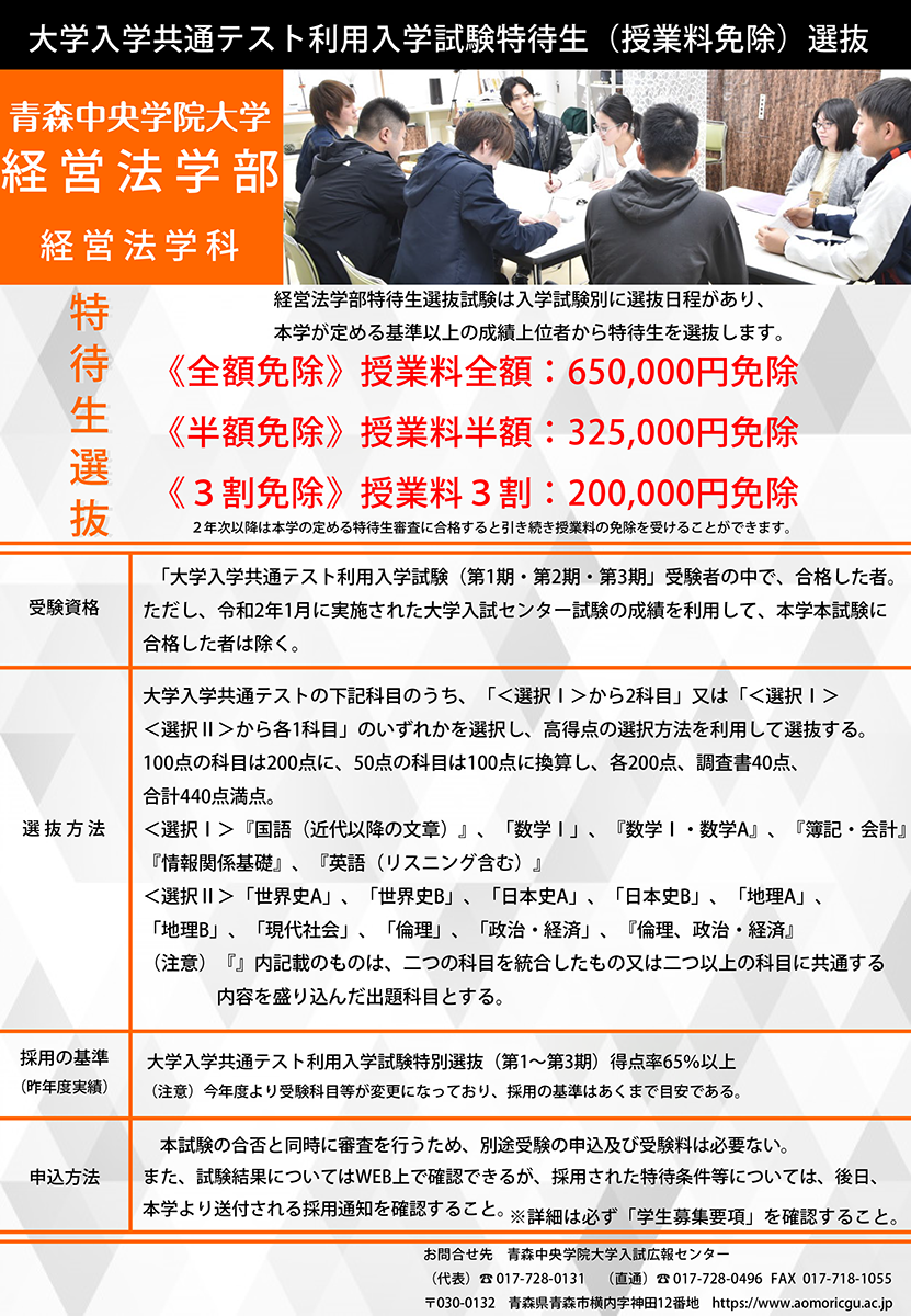 経営法学部は「特待生選抜試験」「大学入学共通テスト利用入学試験特待生選抜」の2種類!