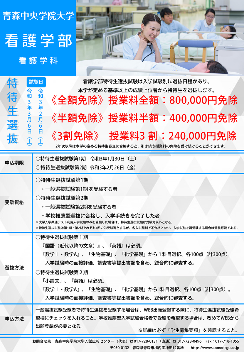 経営法学部・看護学部ともに、本試験の成績上位者(本学が定める基準点以上)の中から、特待生を選抜します。
