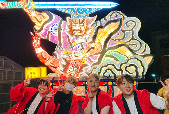 本学の学生も企画段階から実行委員に加わり、ねぶた製作、運行前の食事準備、囃子、ハネト、ねぶた曳き等の運行など多くの学生が関わり盛大に運行し、留学生をはじめ多くの学生が地域の方と交流しながら、青森の伝統文化を学びました。