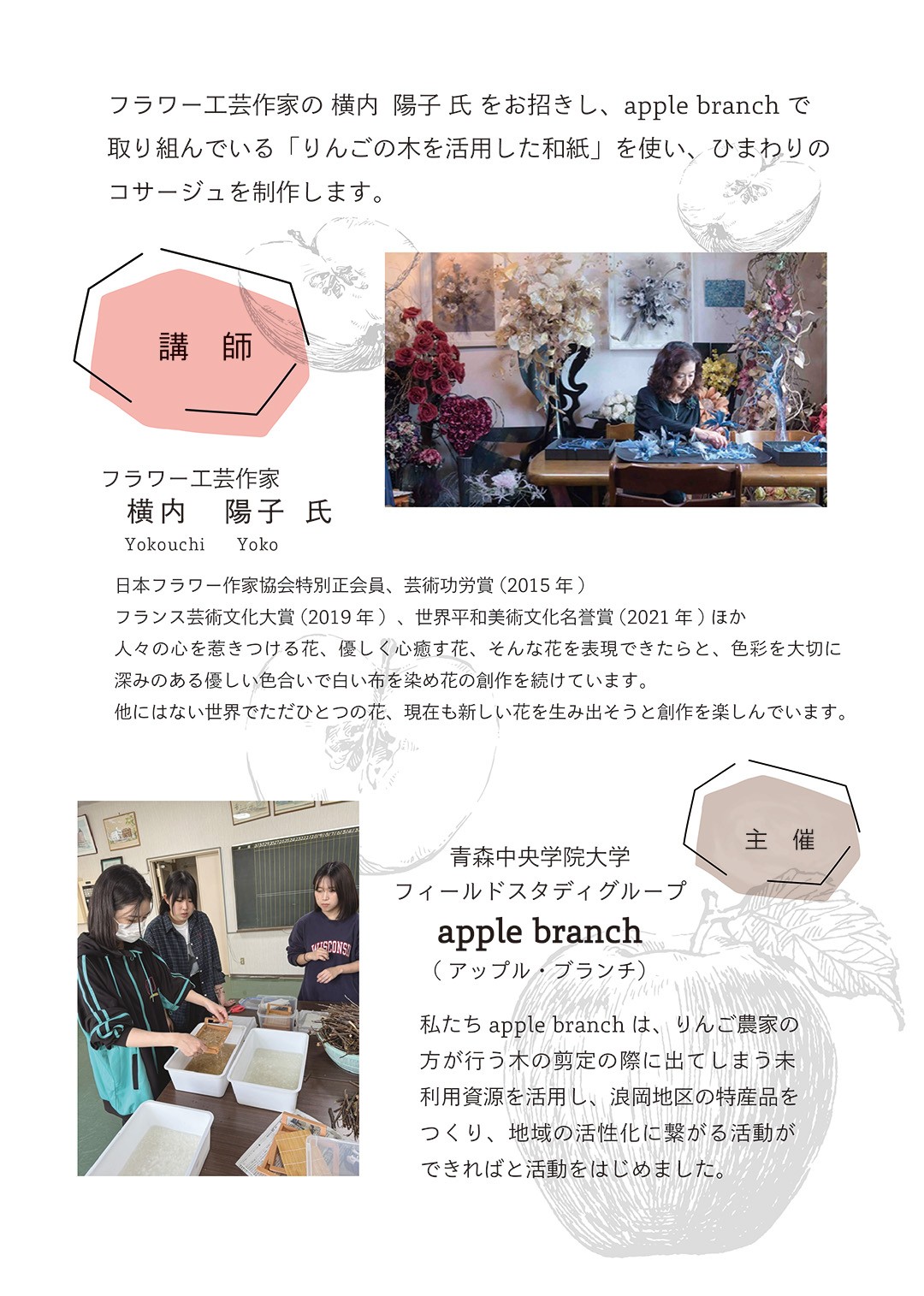この取り組みは、青森市浪岡地区の特産品であるリンゴ由来の地域商品の開発を通して、浪岡地区の活性化を目指すプロジェクトです。今回は、フラワー工芸作家の 横内 陽子 氏 をお招きし、apple branch で取り組んでいる「りんごの木を活用した和紙」を使い、ひまわりのコサージュを制作します。