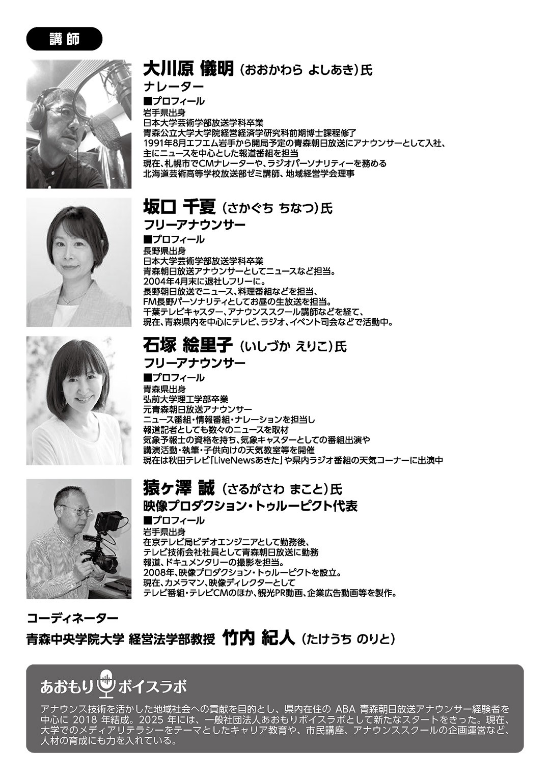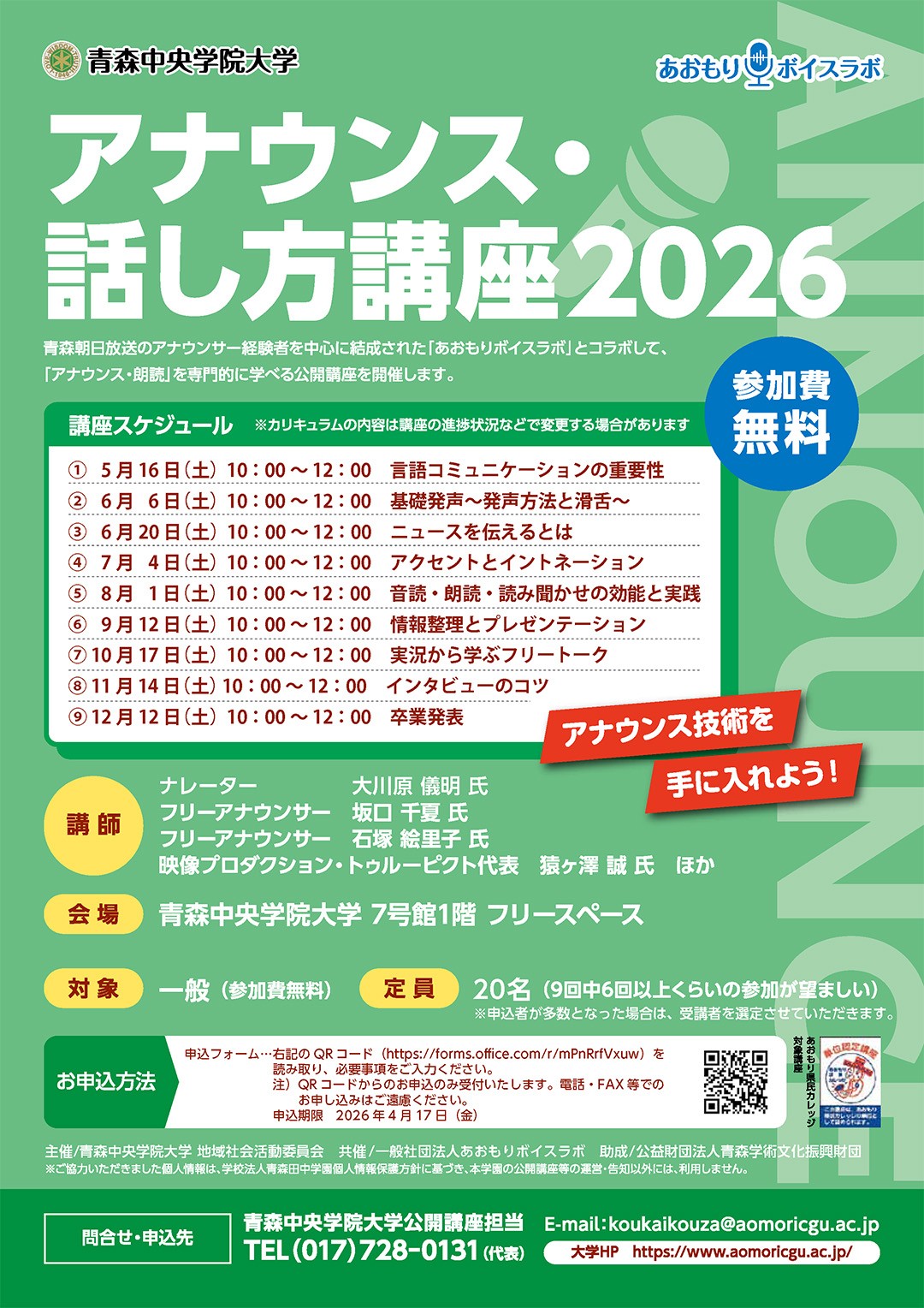 青森中央学院大学では、青森朝日放送のアナウンサー経験者を中心に結成された、一般社団法人あおもりボイスラボとのコラボレーション企画である「アナウンス・朗読」を専門的に学べる公開講座を開催します。