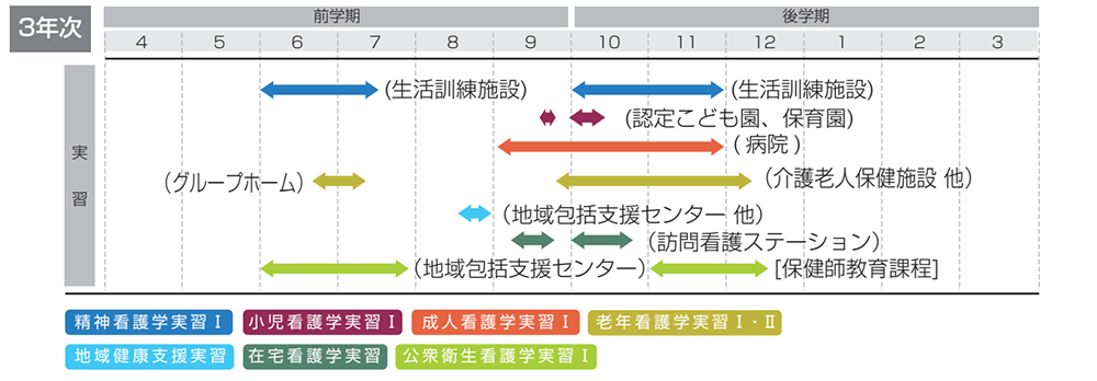 対象者の発達段階や健康課題に応じた専門領域の実習が始まります。病院や施設、保育園や認定こども園、地域の対象者とのかかわりを通して看護実践能力を養います。