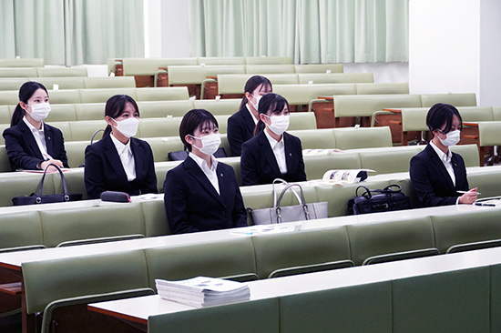リクルートスーツを着た看護学部学生約180人は、それぞれ関心のある施設の教室を訪れ、人事担当者が説明する施設概要や業務内容、職場の雰囲気などについての話を伺いました。
