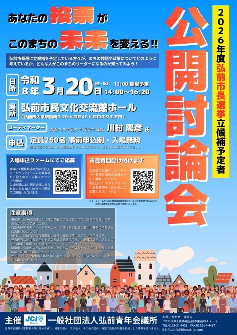 2026年3月20日(金)14時よりヒロロ4階 弘前市民文化交流館ホールにて、弘前青年会議所主催「弘前市長選挙立候補予定者 公開討論会」が開催されます。 経営法学部の川村陽彦専任講師がコーディネーターを務めます。