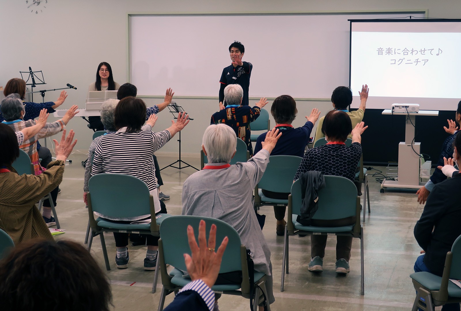 ピアノ伴奏にあわせて行われる動きの指示で、参加者は次々と軽やかに体を動かしていきます。さらに、ペアやグループになって、リズムに合わせながら脳トレエクササイズをするなど、普段とは一味違う特別な予防教室となり、皆さん笑顔で脳を活性化させていました。