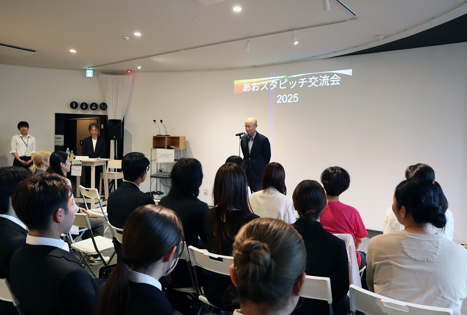 2025年10月8日、あおもりスタートアップセンターの交流イベントの一環として、事業者が自らのビジネスをPRし交流を図る「あおスタピッチ交流会2025」が開催され、経営法学部2年の小松原聡ゼミ学生が参加しました。