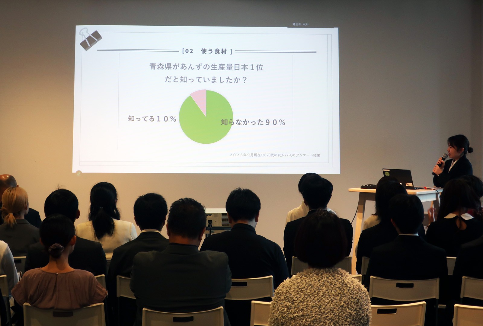 小松原ゼミの学生は、「青森のまだ知られていない特産品を発信しよう」と題して、青森県が日本一の収穫量を誇る果実の「あんず」を使用した商品開発の取り組みについて、分かりやすい説明でプレゼンしました。