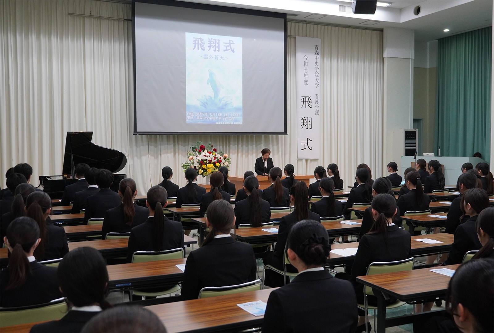 「飛翔式」は、看護学部2年生が、基礎看護学に引き続き、幅広く専門科目を学び始める2年次後期に、大学で看護学を学ぶことの意義を探究し、今後の学修に臨むにあたっての学修の志を明確にするために行われています。