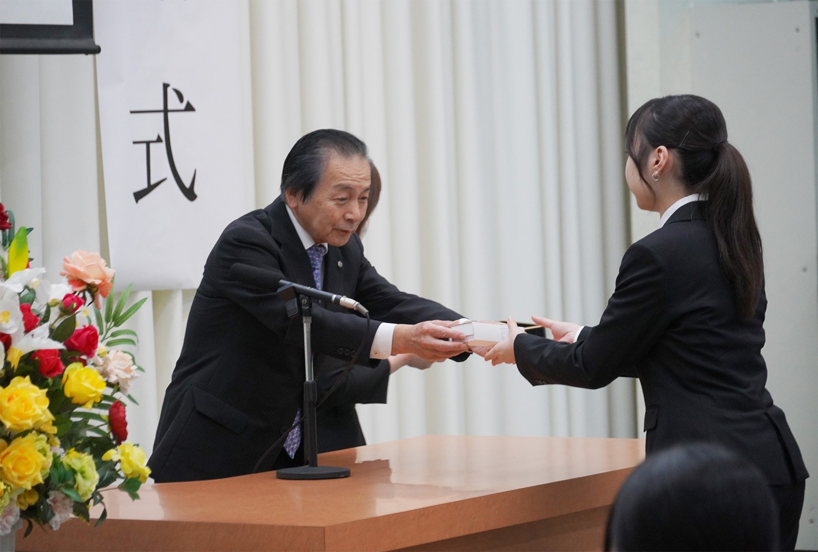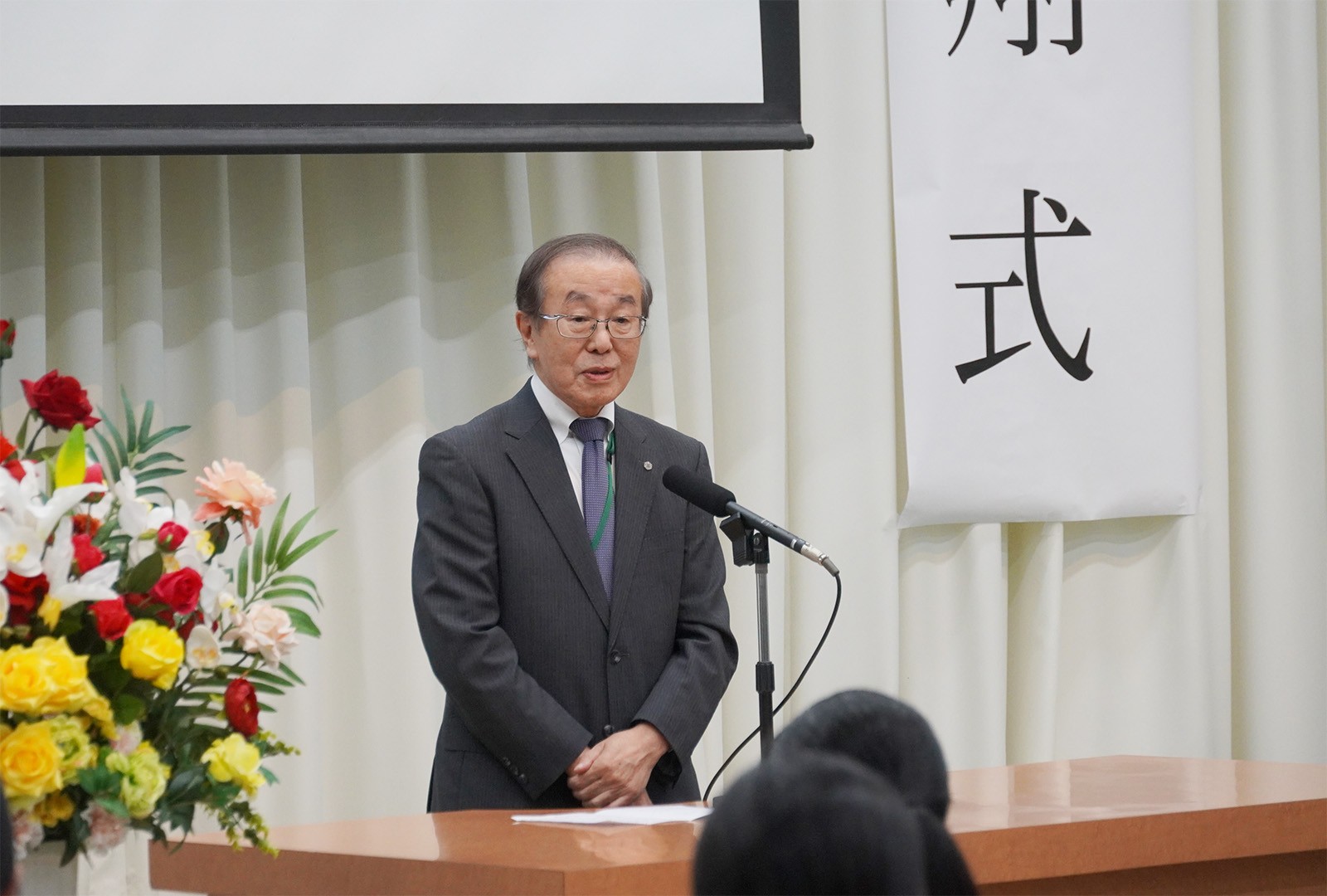 佐藤敬学長、石田憲久理事長から励ましの言葉をいただき、記念品としてナースウオッチが贈られました。