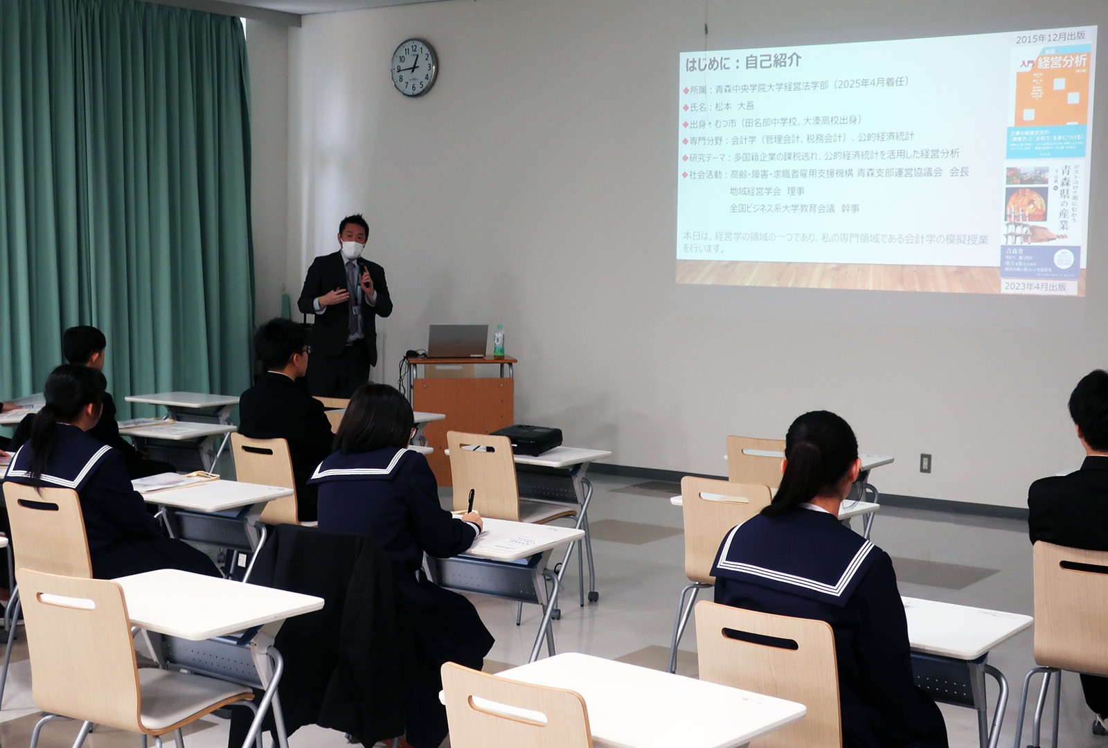 生徒たちは、冒頭で青森中央学院大学と青森中央短期大学について説明を受けた後、看護学部と経営法学部の模擬授業を受講しました。
