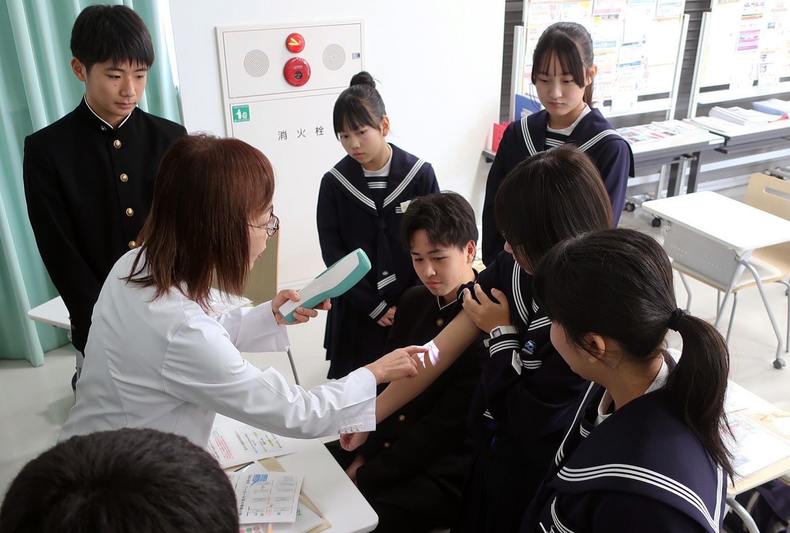 看護学部の三國裕子教授による模擬授業「血管から学ぶ人体の不思議」では、血管の種類と血液の循環について学び、静脈可視化装置を使用して自身の静脈の走行を見ることで、採血に適切な血管の位置を確認しました。