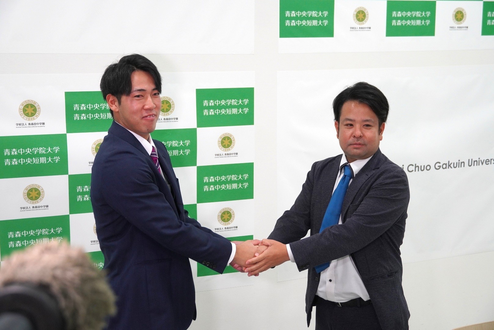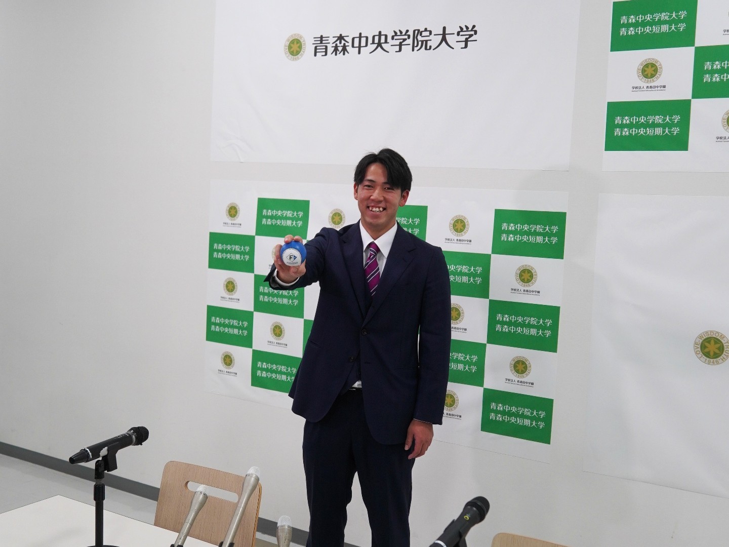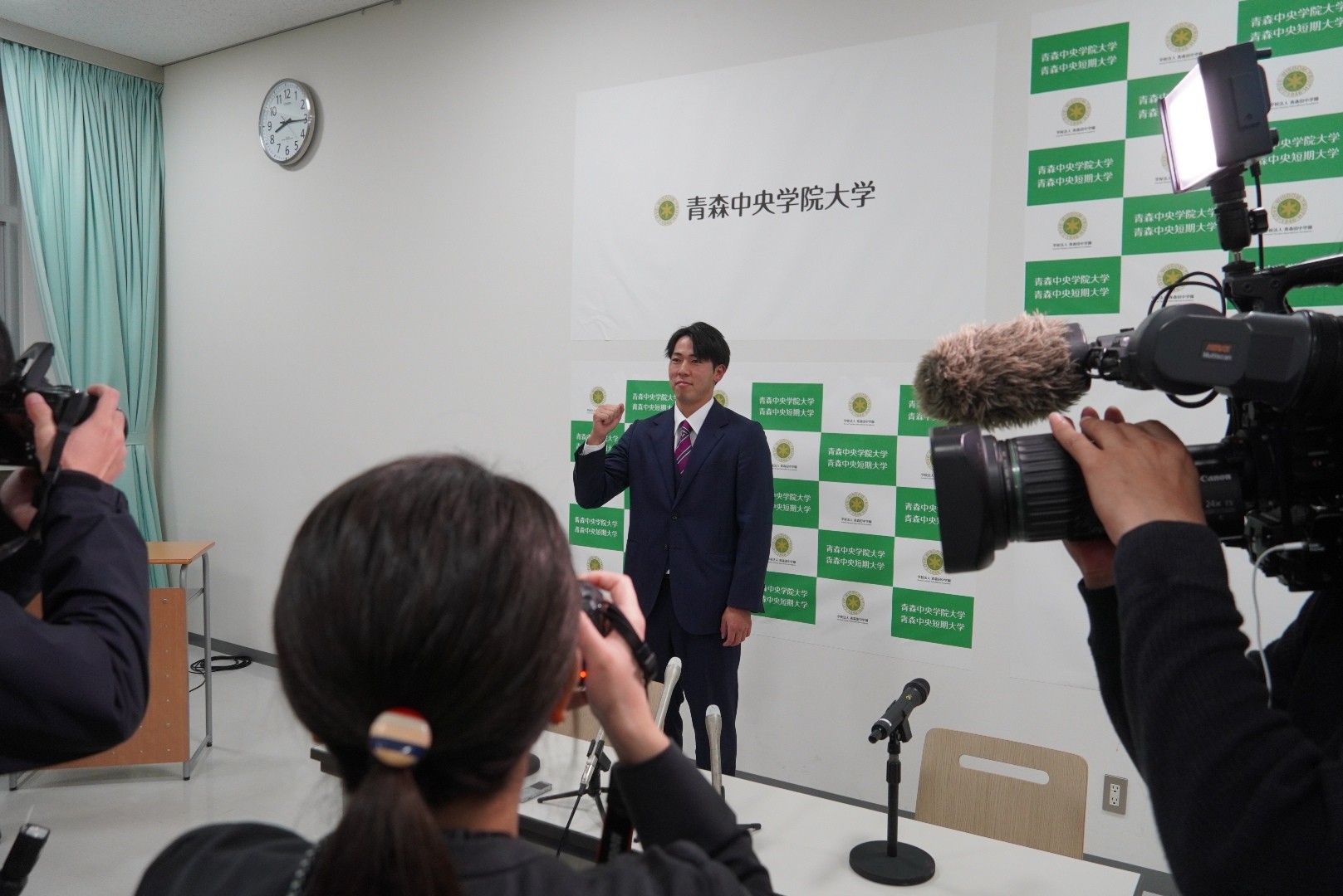 本学硬式野球部の横山永遠選手が、2025プロ野球ドラフト会議において、北海道日本ハムファイターズから育成2位指名を受け、会見を行いました。