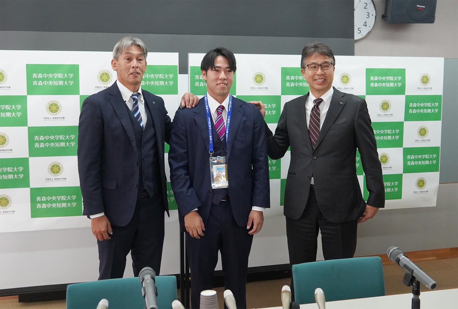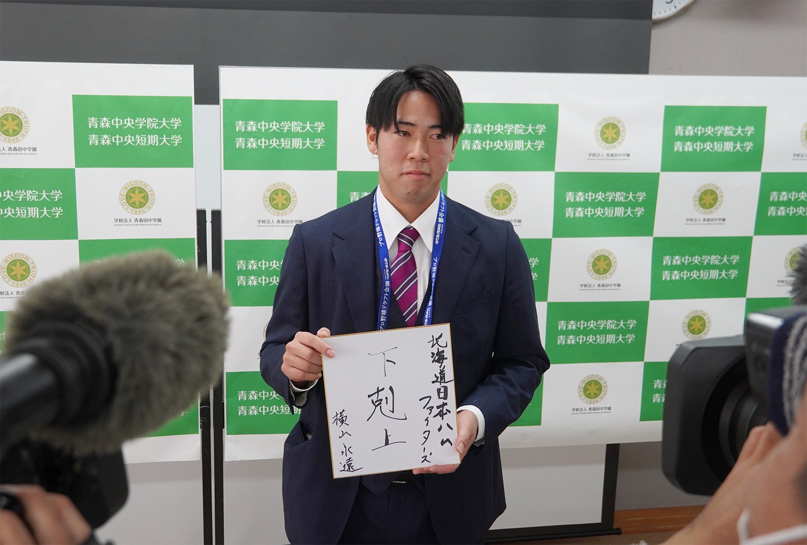 2025年10月31日、北海道日本ハムファイターズより育成2位指名を受けた横山永遠選手が、大渕隆GM補佐兼スカウト部長と白井康勝スカウトから指名あいさつを受けました 横山選手は会見で、「少しでも早く支配下登録されるように頑張りたい」と意気込みを述べました。