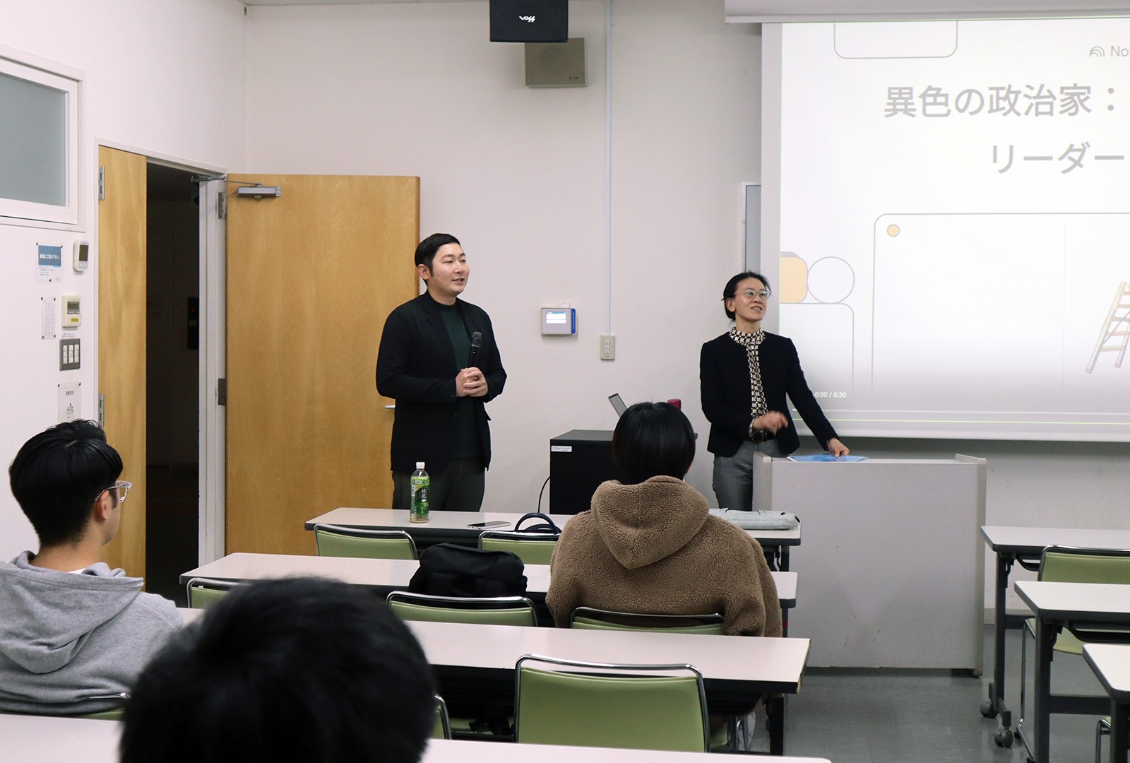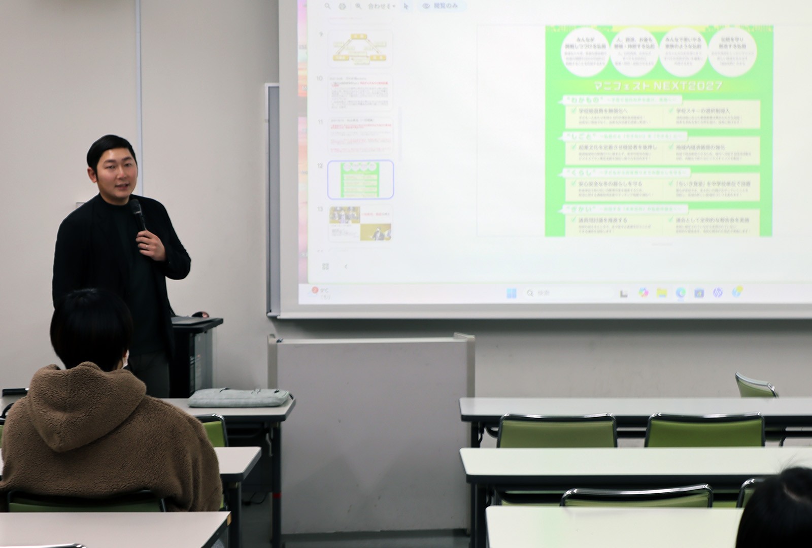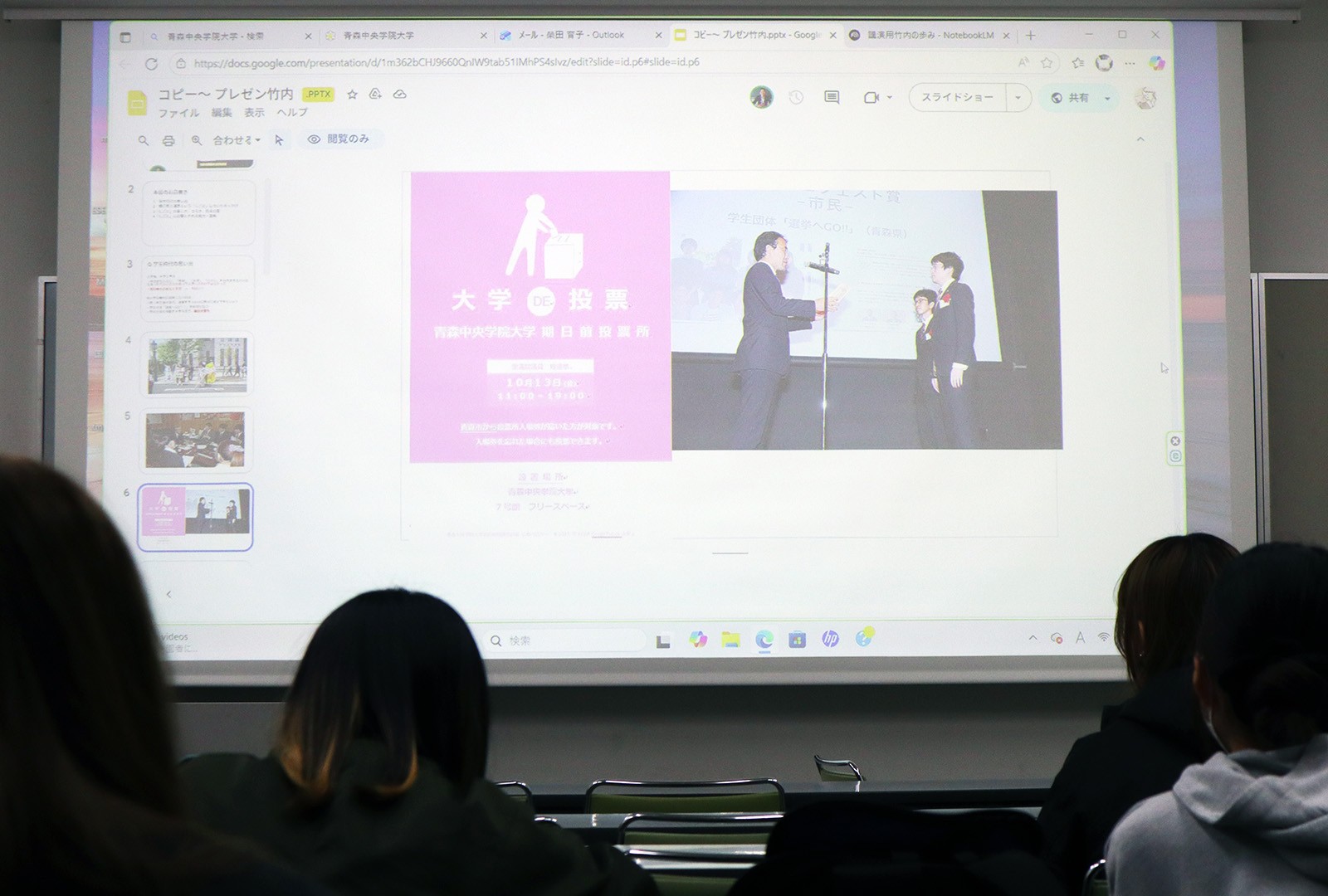 経営法学部「キャリアプランニングⅡ(G)」(榮田育子講師)では、さまざまな業種、職種について学んでもらうため、2025年11月14日、「弘前市議会議員」という仕事を選択した本学卒業生の竹内博之氏をゲストスピーカーに招きました。