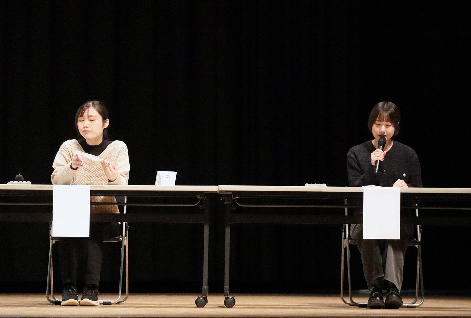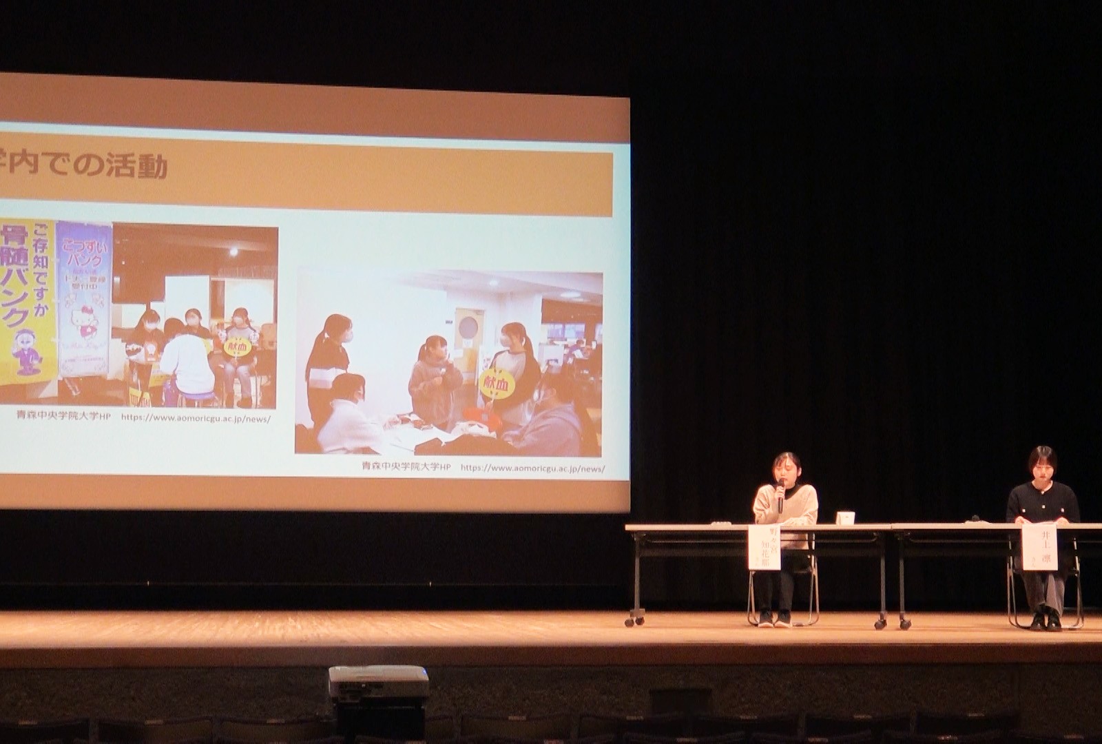 イベントの第1部では、本学の「献血サークルDOTS」の看護学部学生2名が「学生ボランティア ドナー登録説明員~活動の実際~」と題し、若年層の献血と骨髄バンクドナー登録推進を目指して、学内はじめ県内各地で推進活動を行い、先輩から後輩に受け継がれる説明員としての活動について報告しました。また、説明員から登録者へ、実際にどのような説明が行われているのかを発表しました。