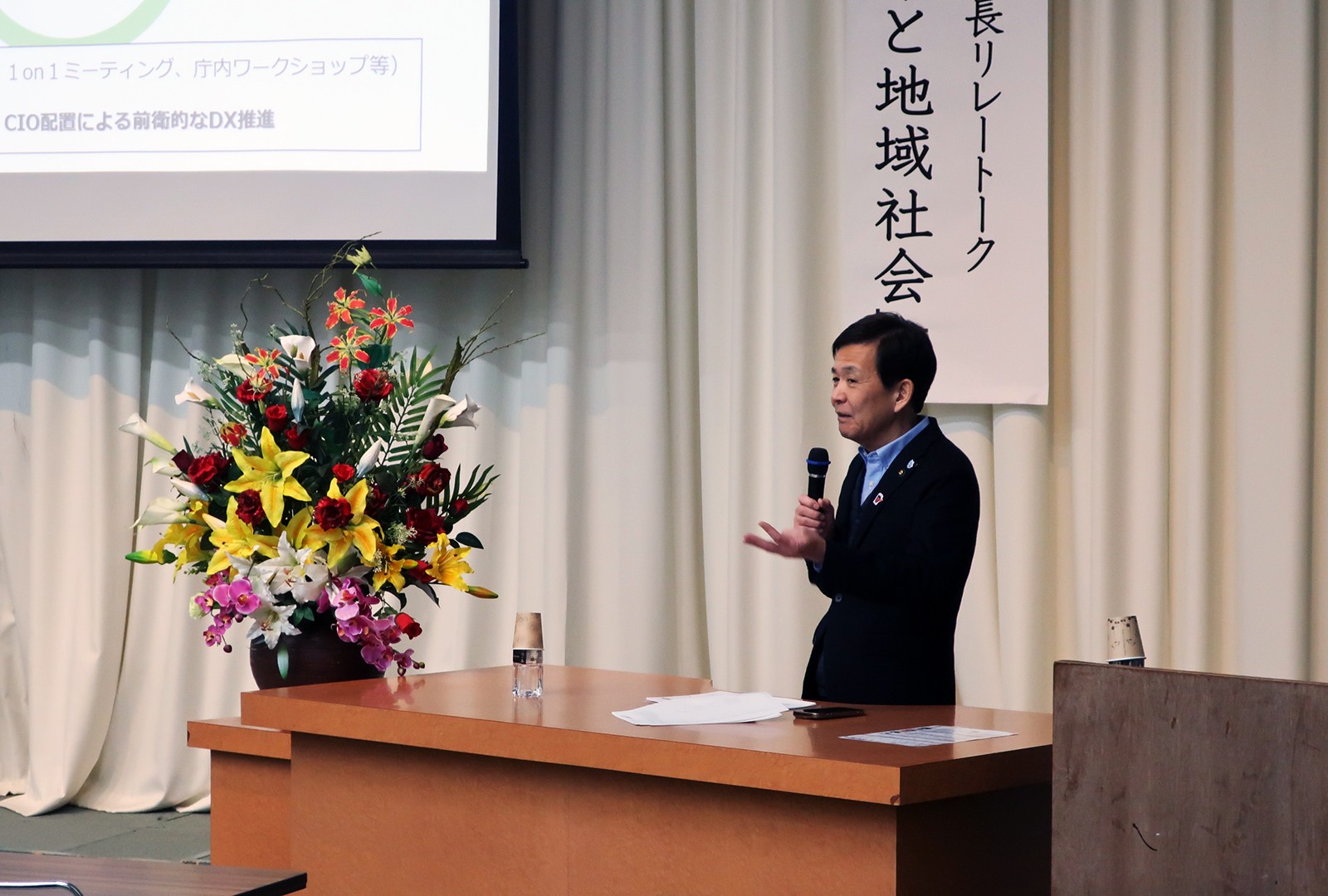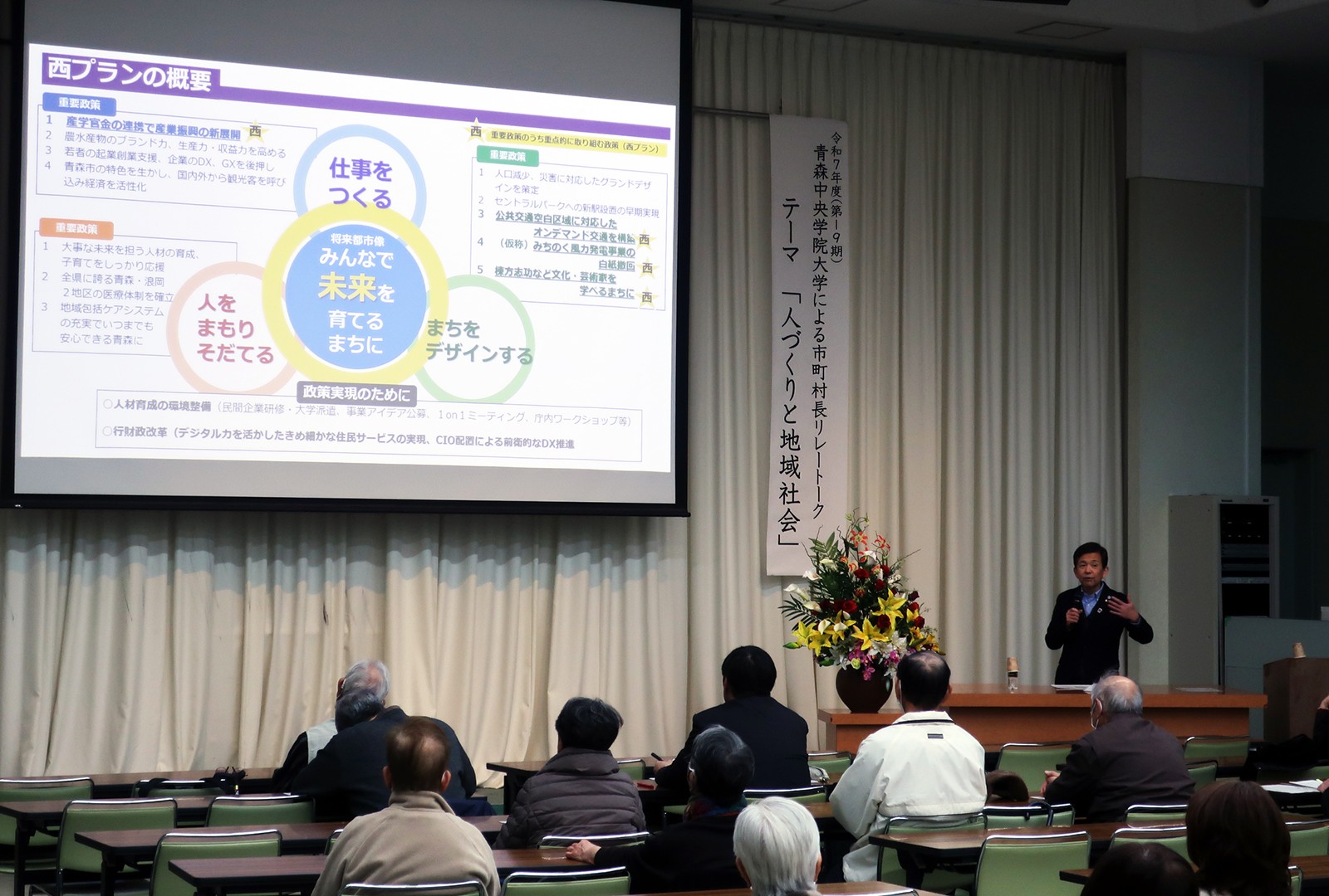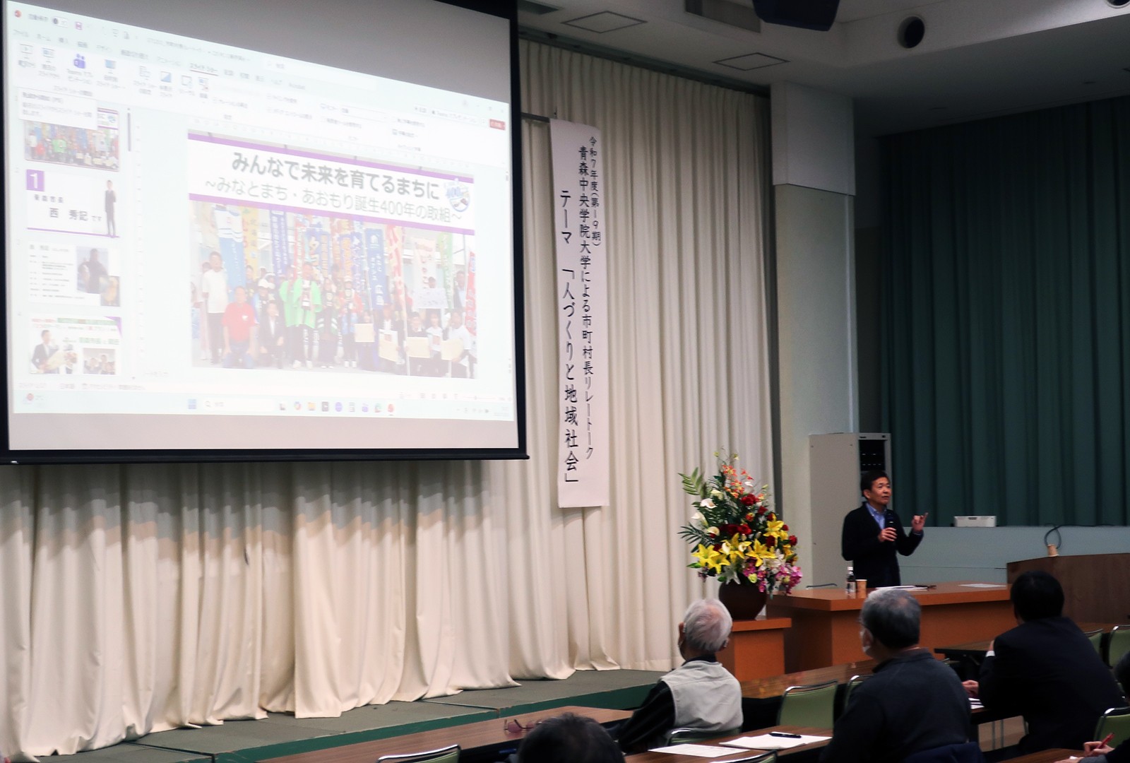 第19回目となる公開講座「市町村長リレートーク」、今年度最終回となる第3回目は、講師に青森市長の西秀記氏をお迎えし、「みんなで未来を育てるまちに」と題して、ご講演いただきました。