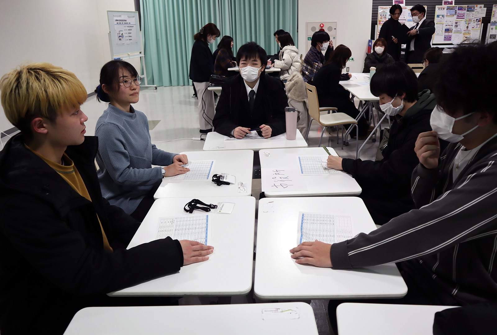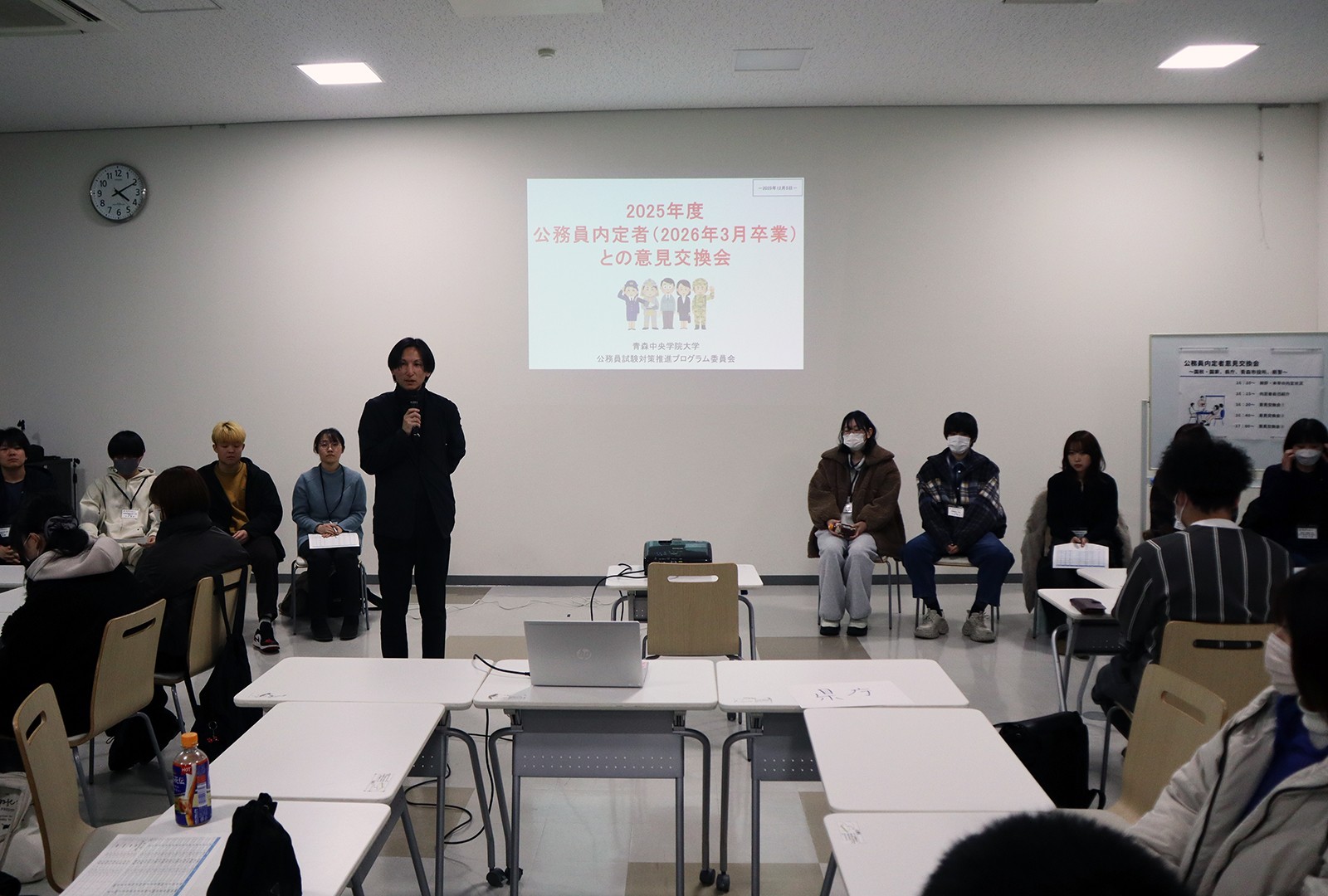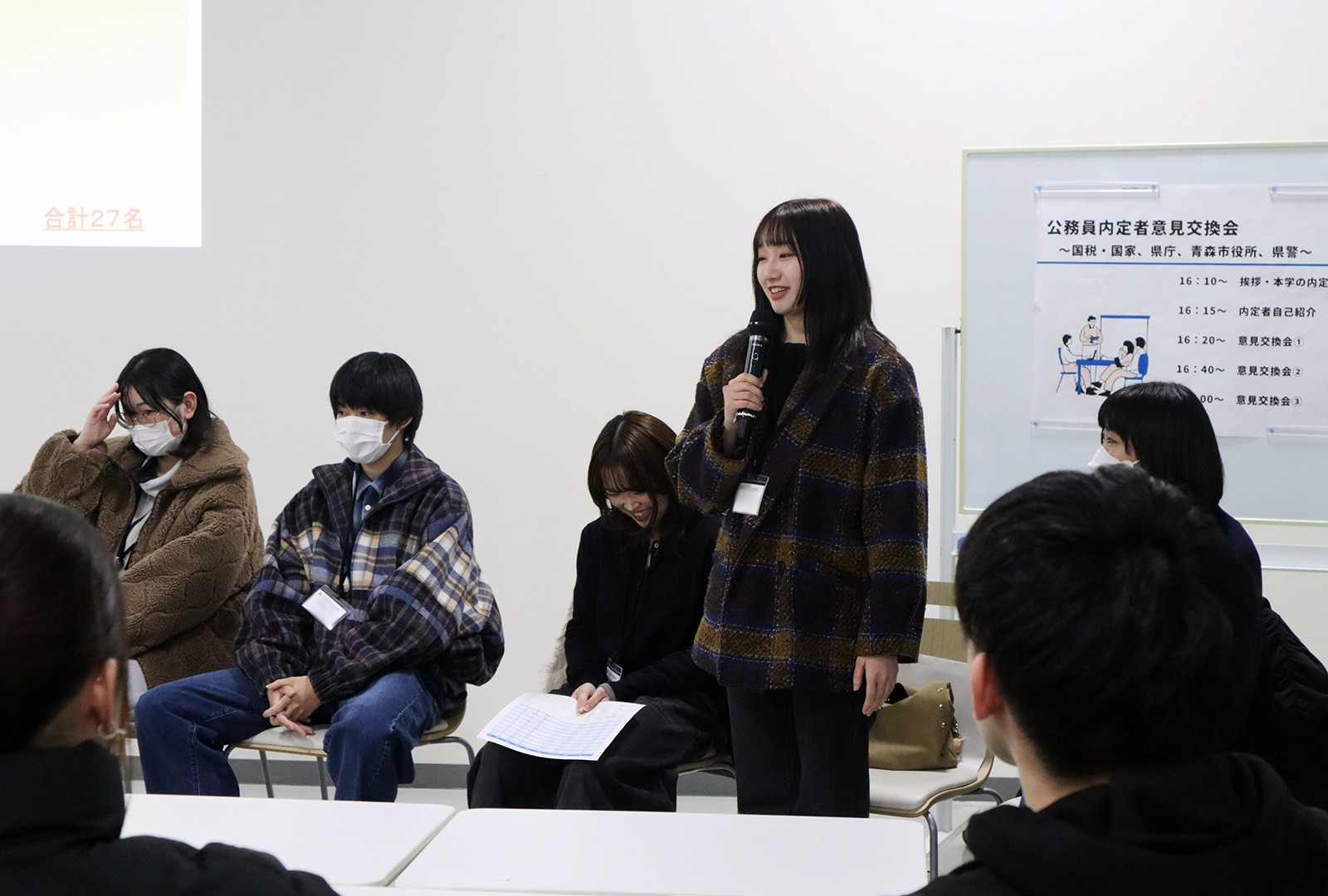 意見交換会では、国家公務員・国税専門官、青森県庁、青森市役所、青森県警の4グループに分かれ、合格者と1~3年生が座談会形式で、公務員試験の勉強方法や合格内定までの道のりについて自由に懇談しました。