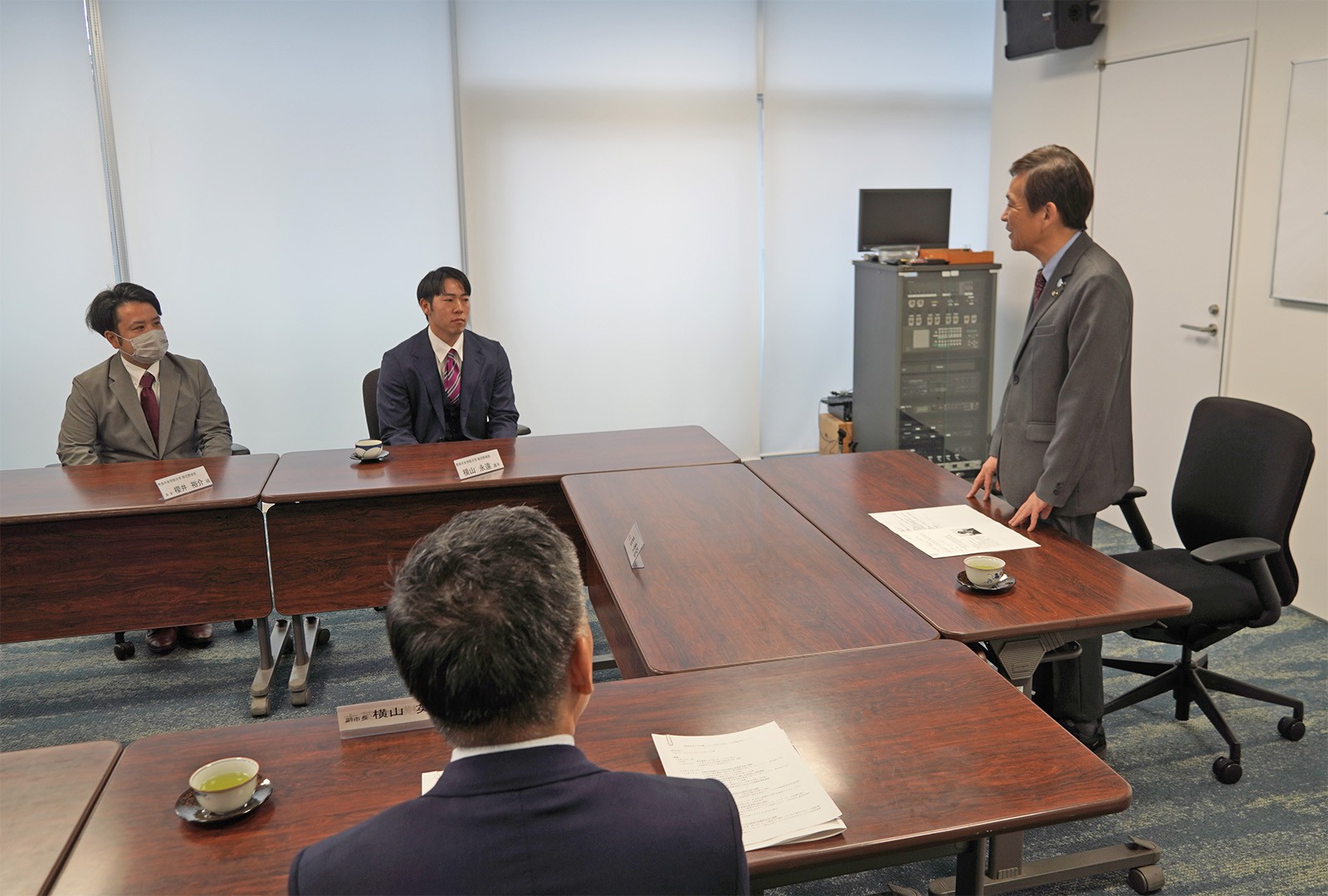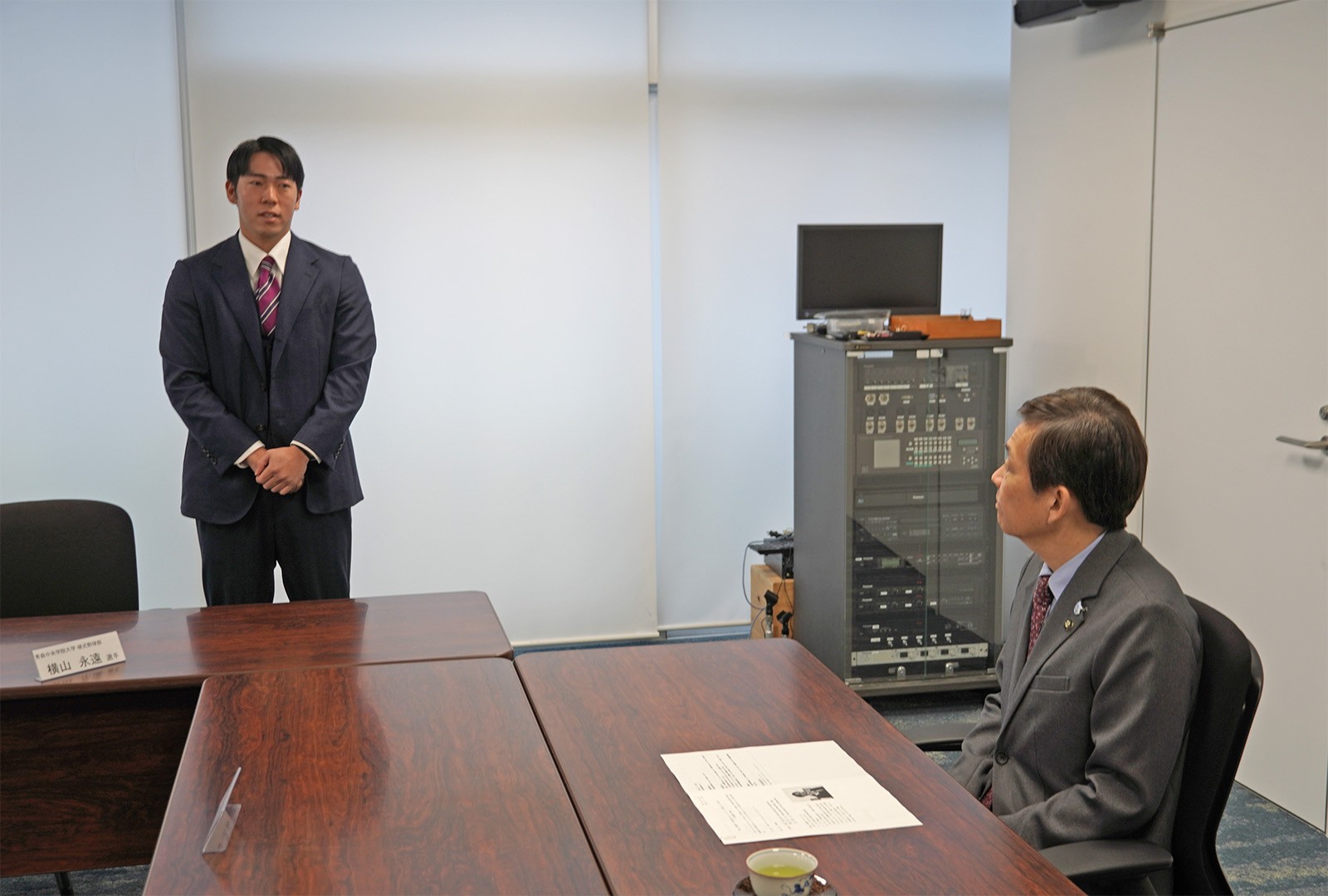 横山選手は硬式野球部 櫻井祐介監督と学生生活支援課 古山正英課長とともに青森市役所を訪問し、「すぐにでも一軍で活躍したい。自分が頑張ることで子どもたちに希望を与える選手になりたい」と抱負を語りました。 西市長は「これから活躍して、みんなが自慢できる選手になって欲しい」と激励しました。