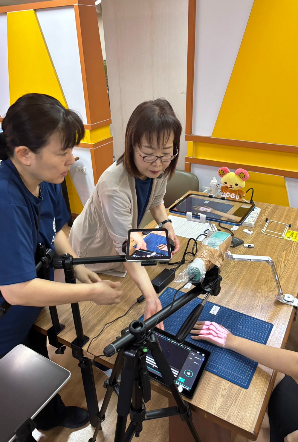 この調査は、科学研究費助成事業の補助による研究「上肢と足背における日本およびアジア圏の人の安全な静脈穿刺部位の解明」を基に行われています。上下肢の静脈や動脈の調査を受けた看護学生は、興味深そうに機器を観察したり質問をしたりしていました。