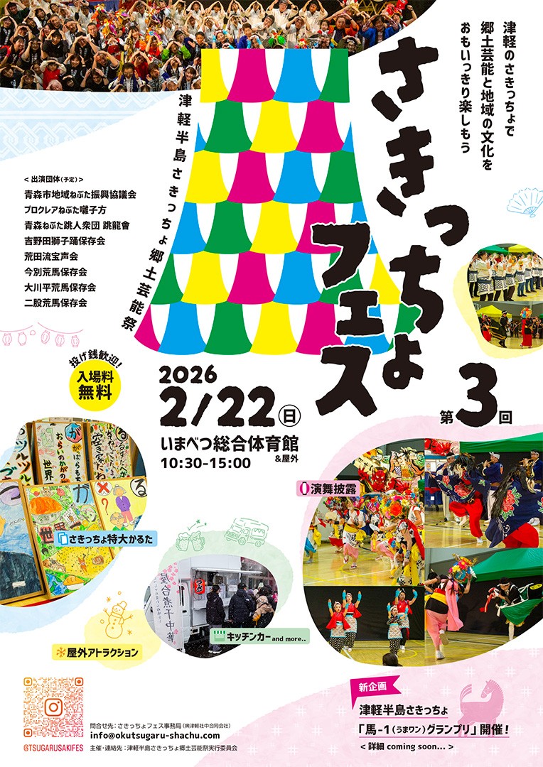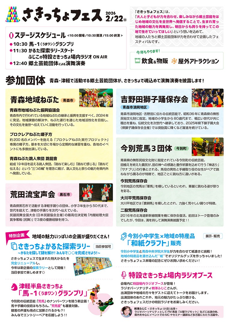 2026年2月22日、今別町で行われる「第3回津軽半島さきっちょ郷土芸能祭」(さきっちょフェス)に、昨年に引き続き本学の学生が参加します。