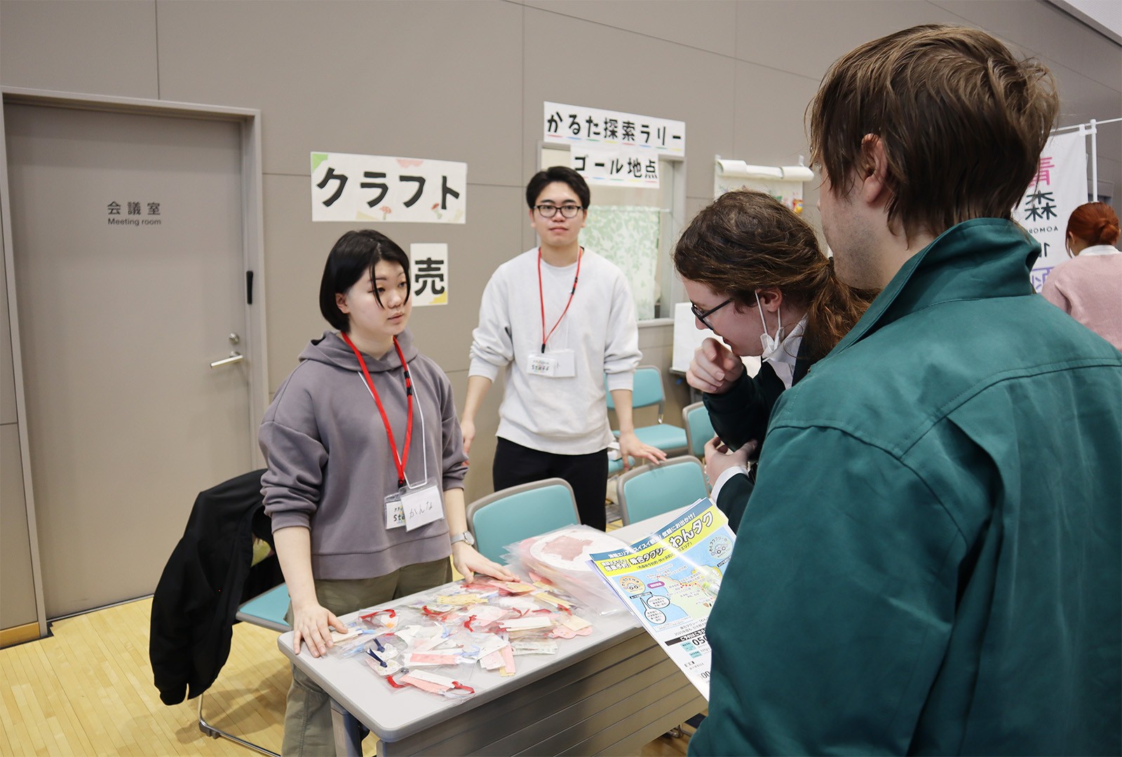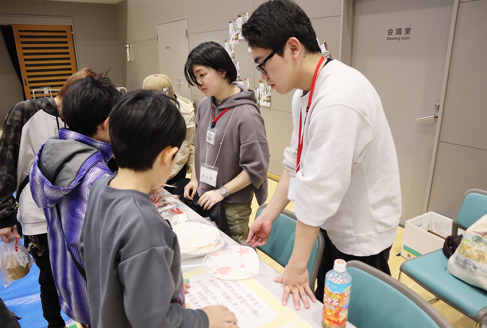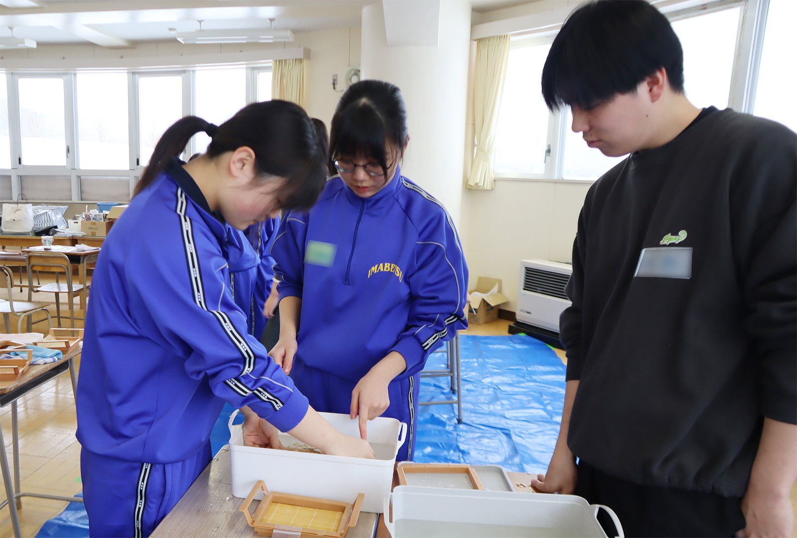 開催にあたって、ゼミ生たちは2月3日と2月10日に今別町を訪れ地元の小中学生と一緒に紙漉きを行い、その和紙でうちわとしおりをを制作しました。