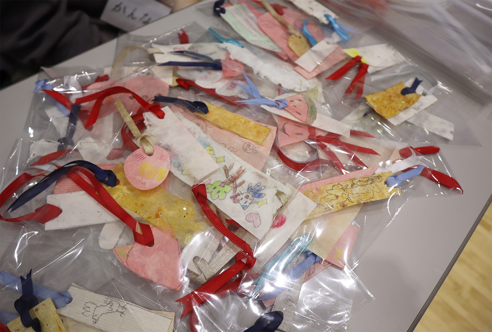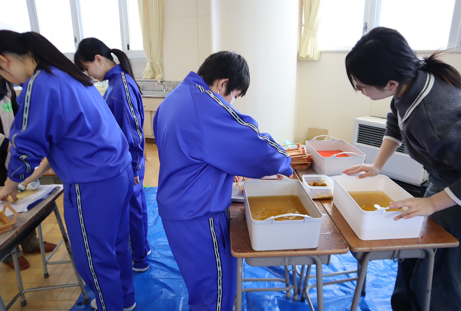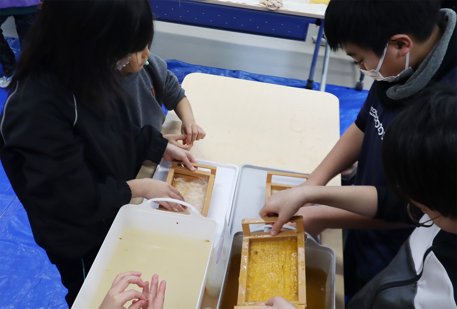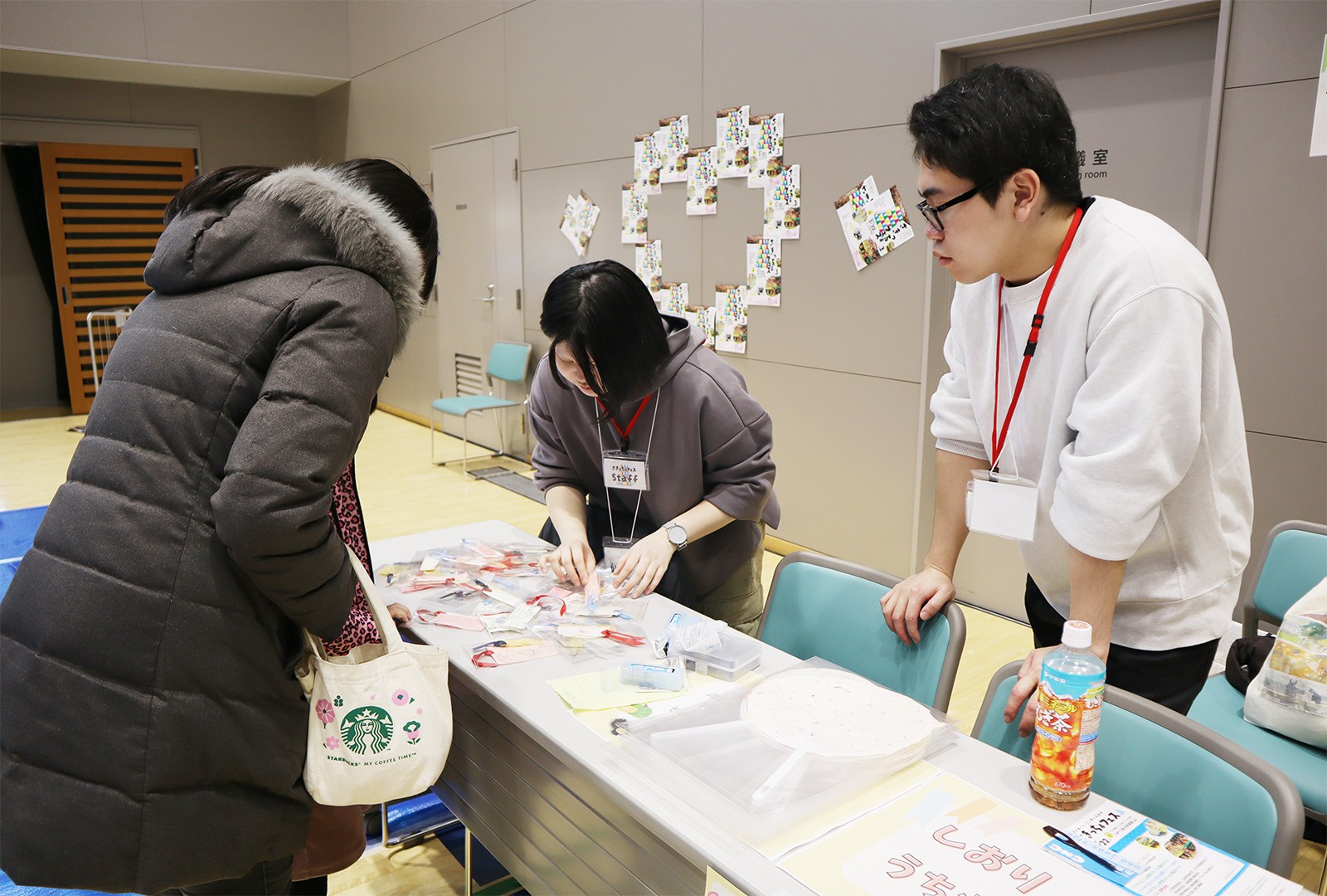 開催にあたって、ゼミ生たちは2月3日と2月10日に今別町を訪れ地元の小中学生と一緒に紙漉きを行い、その和紙でうちわとしおりをを制作しました。