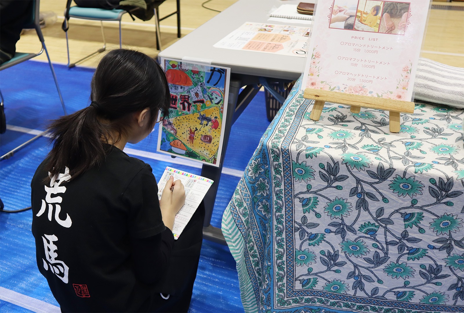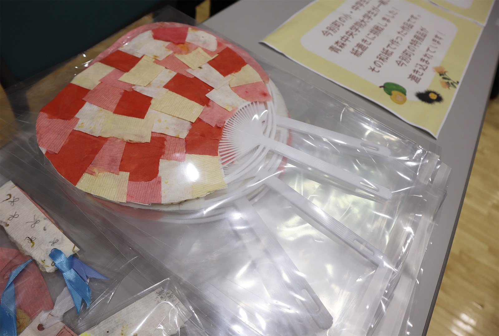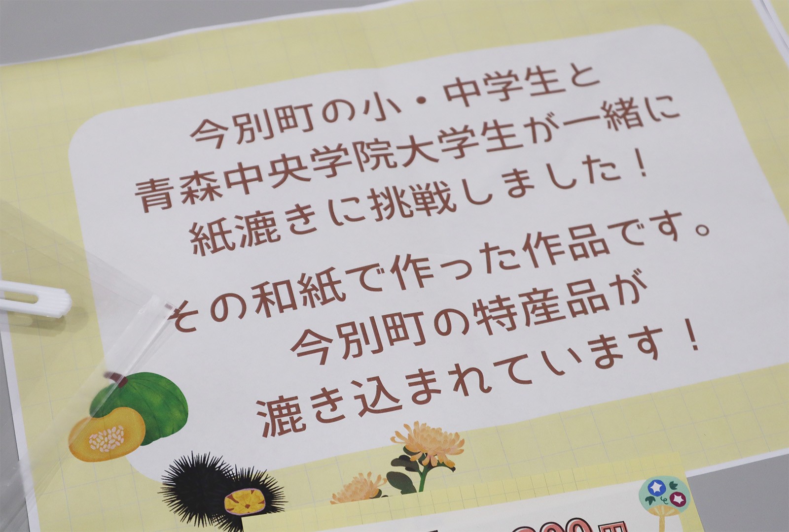 今年度は経営法学部 竹内紀人 教授(地域経済論)ゼミの学生が、地元の今別小学校・今別中学校の児童生徒と協力し、地域の特産品を漉き込んだ“紙”でうちわとしおりを販売しました。